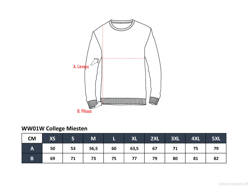 Kangas: 80% puuvilla / 20% polyesteri, 280 g/m²Koot: XS, S , M , L , XL , 2XL , 3XL (Musta ja valkoinen: 4XL, 5XL)Leikkaus: FITTEDKatso mittataulukko alhaalta